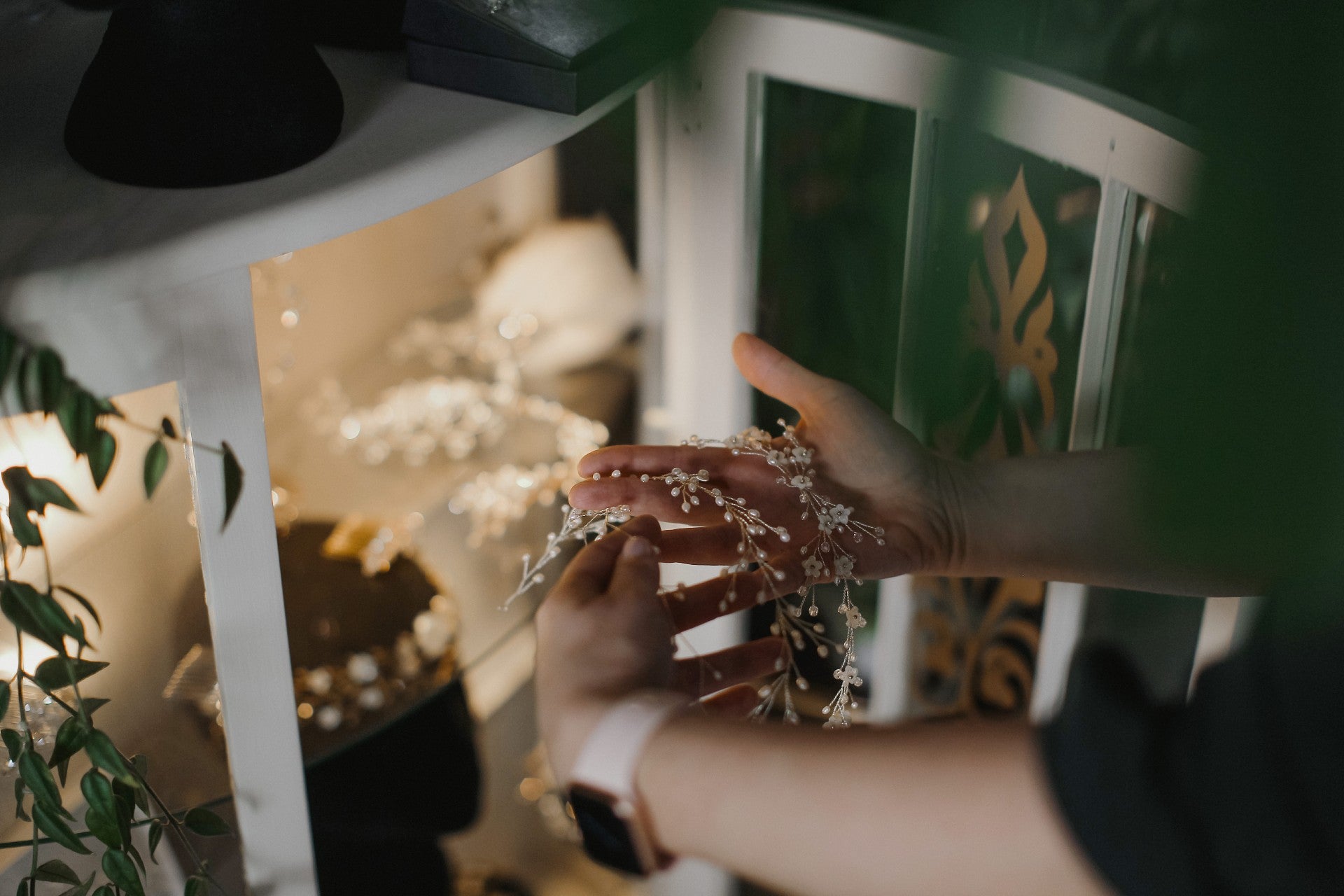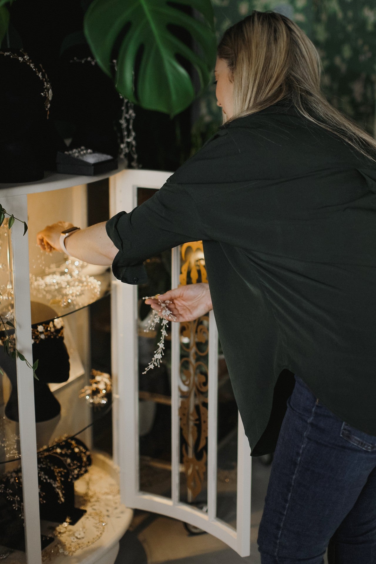 A consultation is an enjoyable process you'll remember long after your wedding day. I take the time to get to know you and your personal style and we'll have a chat about your plans and how you hope to look and feel on your wedding day. You can also ask me any questions about styling and my artistic process and of course see where I make my accessories. Your wish-list of designs will be out ready for you to try, along with any extras I might have picked out for you. You can also browse my accessory cabinets in case any other designs catch your eye.
