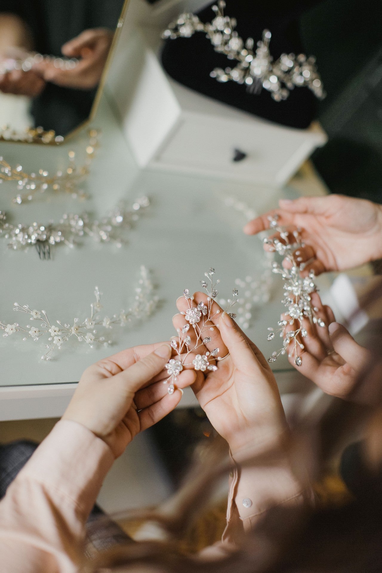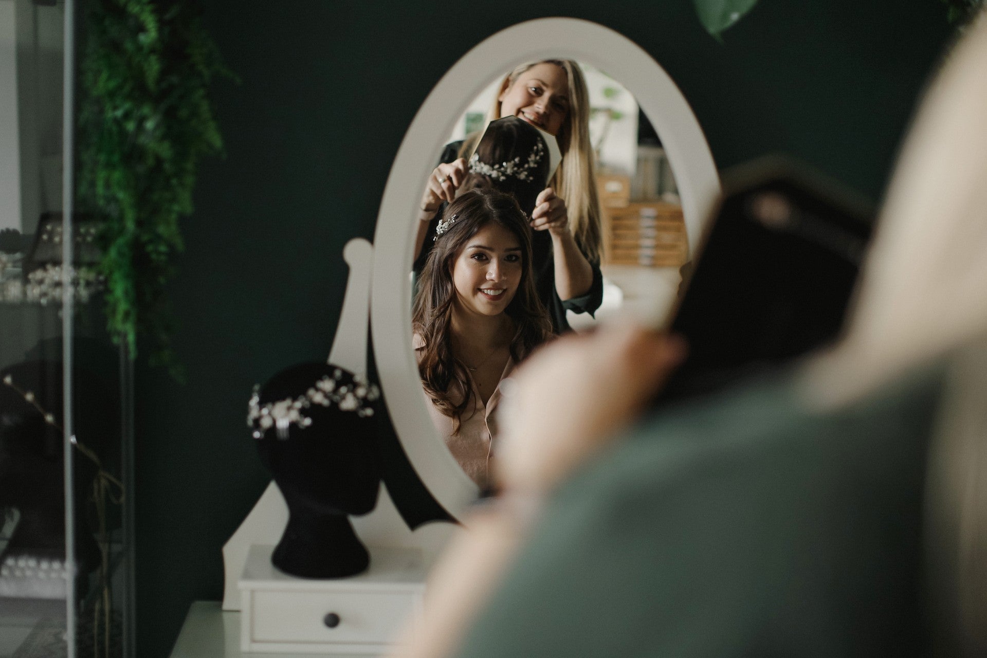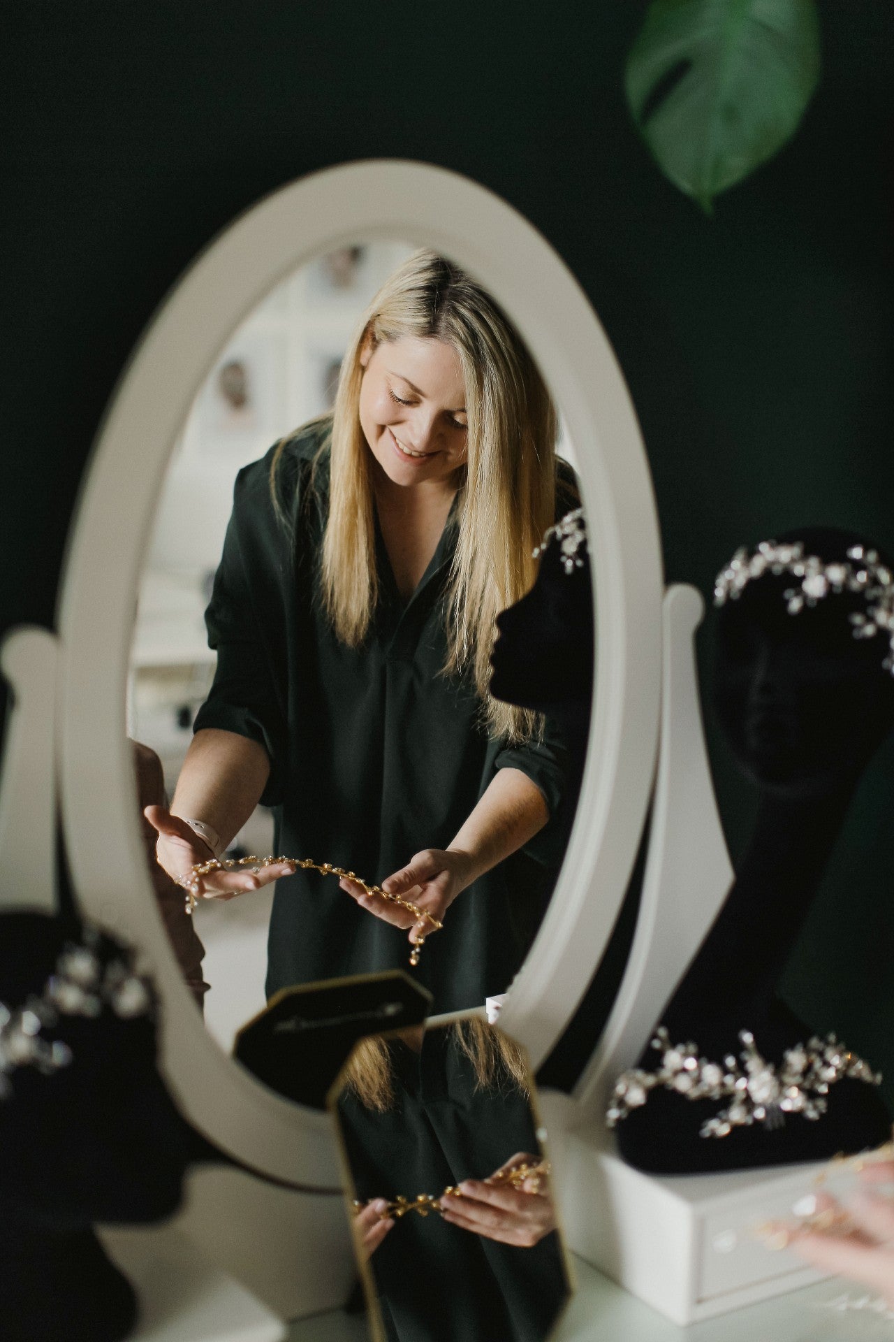 The next bit is the really fun part - trying on accessories! We’ll try headpieces with a few different hairstyles if you haven’t chosen your definite style yet, in lots of different positions, and with or without a veil too – we keep a beautiful simple tulle veil in the studio especially for this or you can even bring your own with you. At the end of this special process you'll have a stunning, hand-crafted accessory made just for you that perfectly complements your dress, your hairstyle, and your personal style, and can be treasured for years to come by you and future generations.